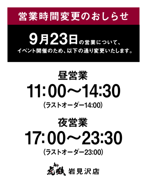9/23はイベント開催のため営業時間を変更いたします。