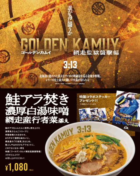 3月12日(木)から映画『ゴールデンカムイ 網走監獄襲撃編』(3月13日公開)とタイアップ企画、限定コラボ ‟鮭アラ焚き濃厚白湯味噌網走産行者菜添え”の提供が 始まります!