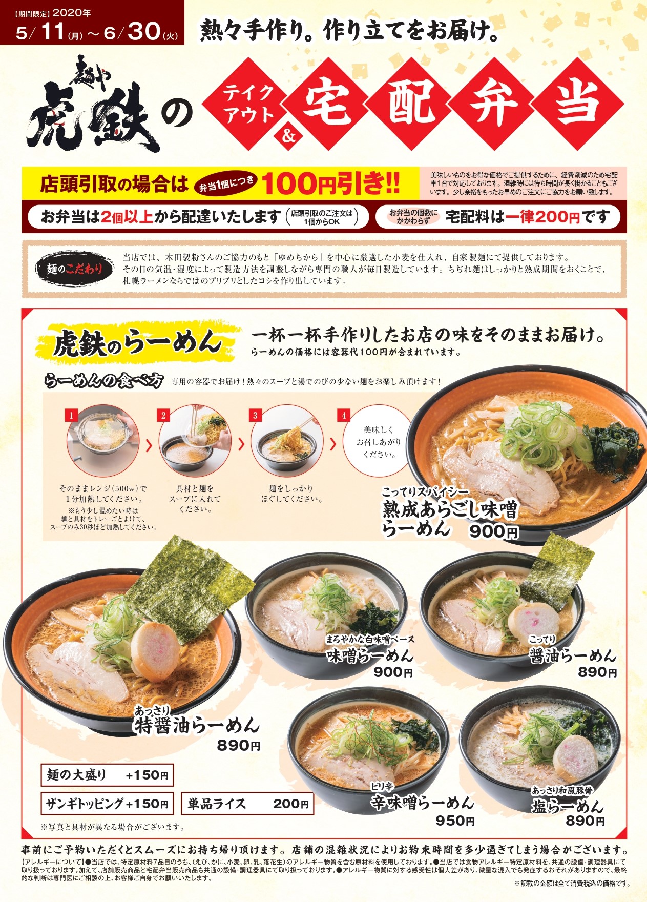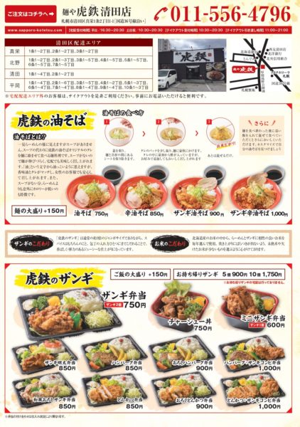 麺や虎鉄各店で宅配&テイクアウトのサービスを実施しております。