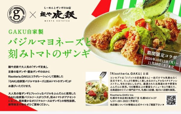 2020年10月12日~11月28日まで、リゾッテリアGAKU×麺や虎鉄がコラボした「バジルマヨネーズと刻みトマトのザンギ」を販売いたします。