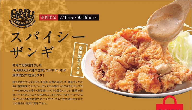 7月15日~9月26日まで大人気店「スープカレーGARAKU」とコラボした「スパイシーザンギ」を麺や虎鉄全店舗にて販売します。